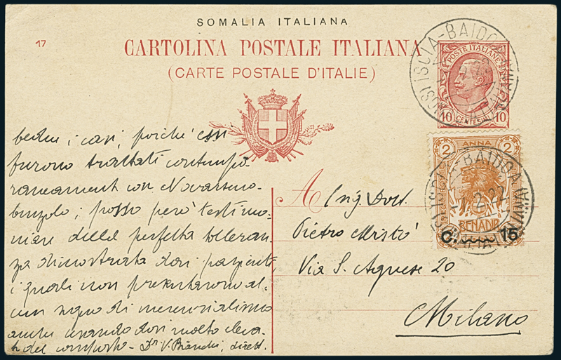 1919-36, quattro interi postali, di cui due soprastampati tipo Leoni da 10c. per Chisimaio con arrivo inglese sul fronte, l'altra con affr. compl. (13); il terzo, Michetti 40c. da Mahdei-uen, e l'ultimo, intero risposta italiana da Mogadiscio.