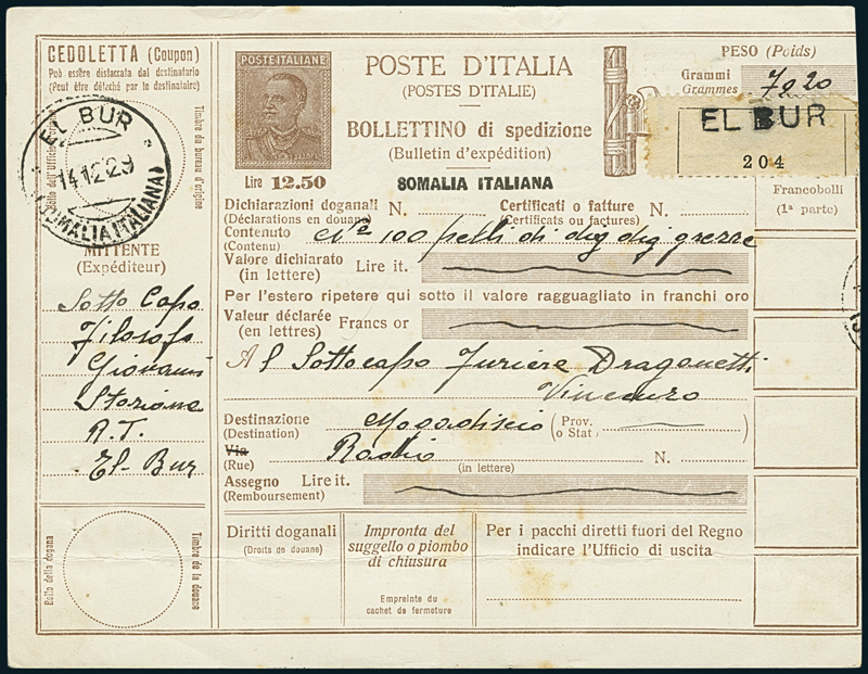 1929, bollettino pacchi tipo "Parmeggiani" da 12,5 lire (filagrano p. 22; Bianchi p. R) del 14 dicembre per Mogadiscio, annullato "El Bur/(Somalia Italiana)" (p. 9). Alcune piccole imperfezioni di piccolo significato. Rarissimo.
