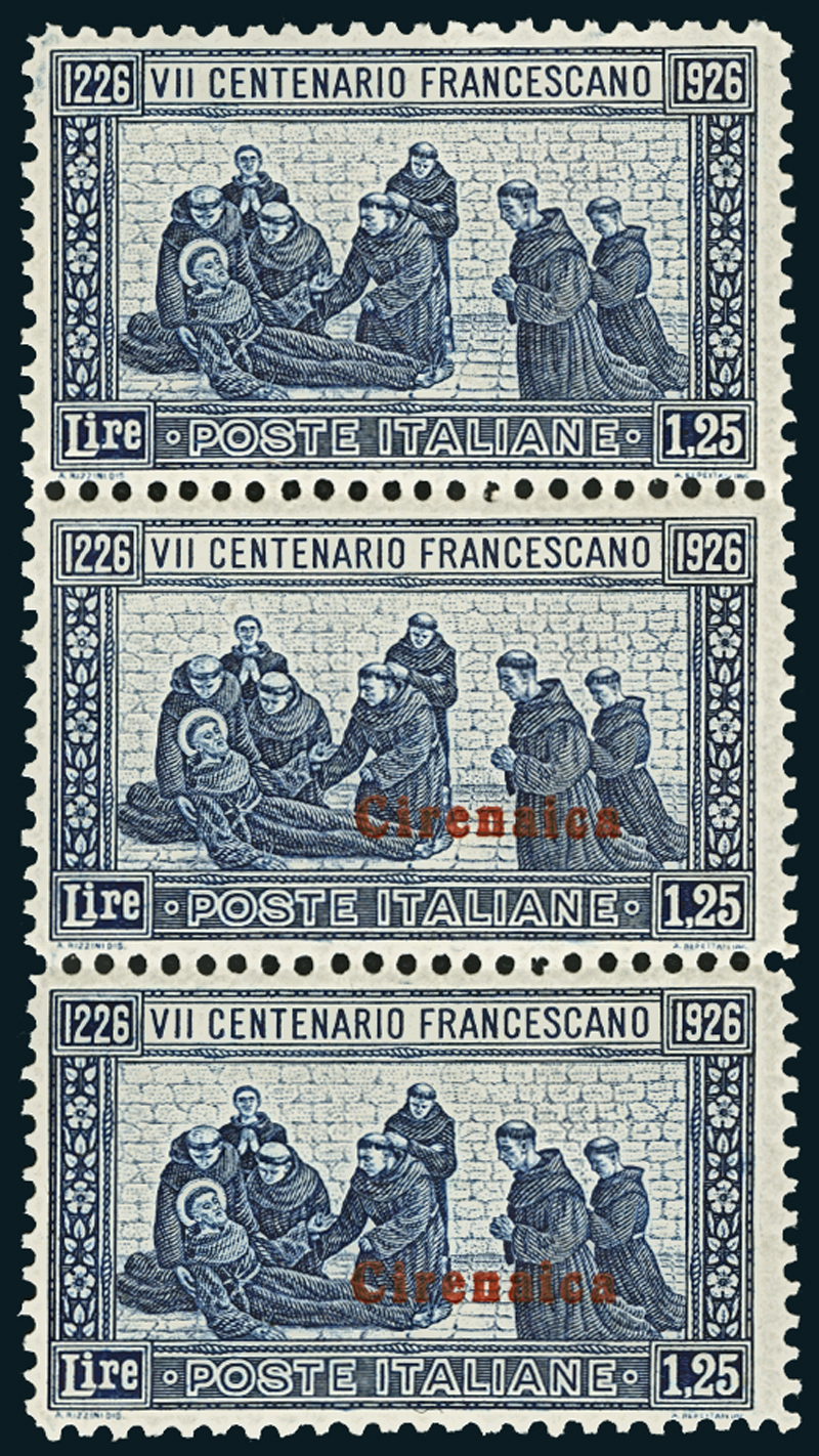 1926, San Francesco, 1,25 l. azzurro, striscia verticale di tre, di cui uno con soprastampa in albino (30b). Cert. A. Diena.
