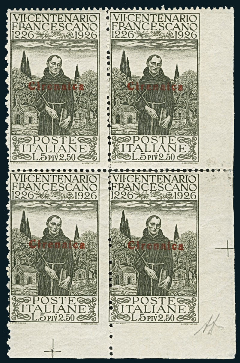1926, San Francesco, 5 l.+ 2,50 l. oliva, quartina, bordo di foglio, comprendente un esemplare normale, uno non dentellato a destra, un altro non dentellato in basso, ed un terzo non dentellato in basso ed a destra (31+31ca+31c+31d). Insieme molto raro e probabilmente unico. Firmato A. Diena.