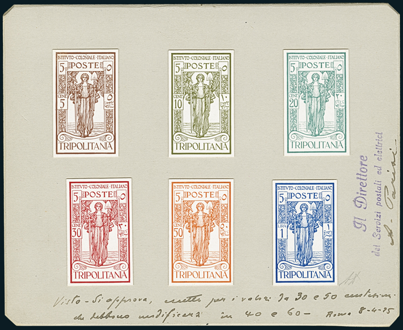 1926, Pro Istituto Coloniale, sei prove d'archivio su carta gessata, montate su cartoncino per la loro approvazione, con manoscritto in basso: "Visto - Si approva, eccetto per i valori da 30 e 50 centessimi che debbono modificarsi in 40 e 60 - Roma 8-4-25" (infatti, i valori da 30 c. e 50 c. non sono stati emessi e furono sostituiti dai valori da 40 c. e 60 c.); inoltre timbro a destra "Il Direttore dei Servizi postali ed elettrici" e firma "A. Parisi". Insieme straordinario e di grande interesse storico-postale. Firmato A. Diena.