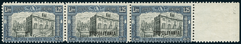 1927, Milizia I, 1,25 l.+ 60 c. azzurro e nero, striscia di tre comprendente, a sinistra, la coppia formata da un esemplare soprastampa albino e l'altro con la soprastampa normale (41a), bordo di foglio. Unica. Firmata Em. Diena.