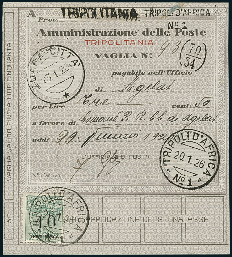 Parte A, con soprastampa in rosso “Tripolitania”, cinque moduli varie affrancature con segnatasse per vaglia di Tripolitania che formano la serie completa in combinazioni diverse (1/6) con annulli dal 1925 al 1926 di Garian, Misurata, Nalut, Tarhuna e Tripoli d’Africa. Insieme raro, di alto valore, ottima qualità, da esaminare.