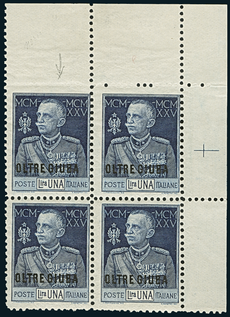 1925-26, Giubileo, 1 l. azzurro, dentellatura 11, quartina angolo di foglio con gli esemplari superiori con dentellatura, da destra a sinistra, da parzialmente cieca a completamente cieca. Rara e vistosa varietà non catalogata.