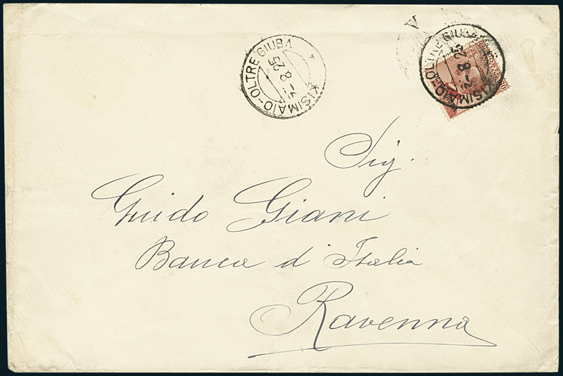 1925, busta del 7 agosto per l'Italia, con dicitura al verso "L'Alto Commissario dell'Oltre Giuba", recante un 60c. (11), annullato "Kisimaio-Oltre Giuba" (p. 9). Affrancatura singola non comune.