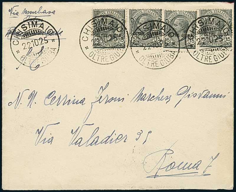 1925, busta del 22 ottobre per Roma, con stemma dicitura al verso "Somalia Italiana/Il Residente di Mogadiscio", affrancata con quattro esemplari da 15 c. (5), con annullo di Chismaio (p. 7). Molto bella e rara.
