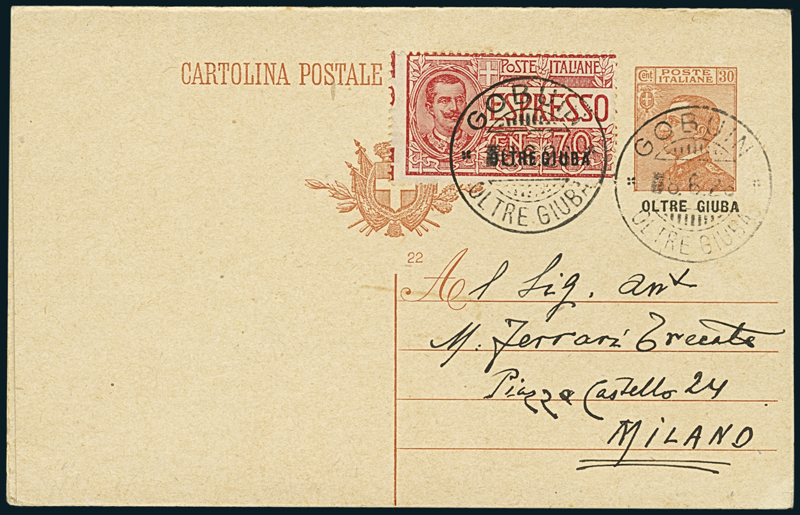 1923, intero postale con risposta pagata da 30 c.+ 30 c. (Pertile 2, mill. 22), dell'8 giugno 1926 ed Espresso da 70 c. (1), con annullo "Gobuin/Oltre Giuba" (p. RR). Filatelica, ma rarità con francobollo non quotato su lettera, impreziosito dall'annullo e l'intero postale.