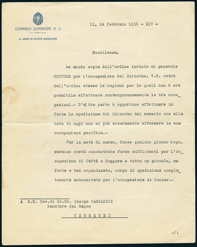 1936, lettera del 24 febbraio 1936 dal capo di S. M. del Comando Superiore dell'Africa Orientale Generale Melchiade Gabba, indirizzata al Governatore delle Colonie Gasperini, nella quale si danno istruzioni per l’occupazione dei territori di Caftà, Noggara Gondar. Molto interessante.