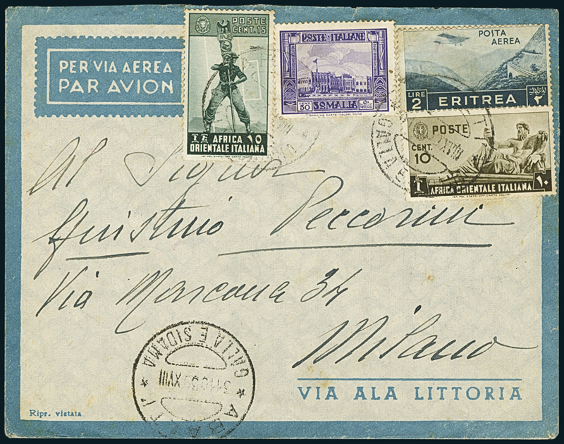 ABALTÍ. Busta per Milano affr. con P.A. 2l. (23), A.O.I. 10c. e 15. (4, 5) e Somalia 50c. (221), annullati "Abaltí/Galla e Sidamia/31.10.39" (p. 13).