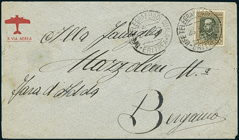 ADI QUALA. 1937-38, tre lettere di cui una affrancata con 50 c. (199) annullato con "Uff. Telegraf.co Adi-Quala/Eritrea" (p. 10), le altre due, una raccomandata ed una assicurata dell'amministrazione postale, con annulli diversi "Adi Quala/Eritrea" (p. 8 e 10).
