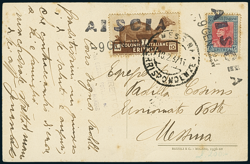 AISCIA. Cartolina per Messina affr. con 20c. (196) e 10c. (205), nitidamente annullati con il timbro lineare, accompagnato dal datario "Aiscia/9 Gen 1937 Anno XV" (p. 13), con a lato timbro lineare a tre righe "Il Direttore/dei Servizi Postali ed Elettrici/dell'Harrar". Qualche lieve macchia di ossidazione senza importanza. Molto rara.