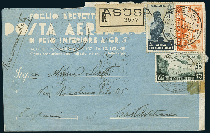 ASOSA. Raccomandata per l'Italia con A.O.I. 1,75l. (14) e P.A. 25c. ed 1l. (A1, A5), annullati "Asosa/Galla e Sidama/2.5.40" (p. 13). Alcune imperfezioni, comunque uso molto raro.
