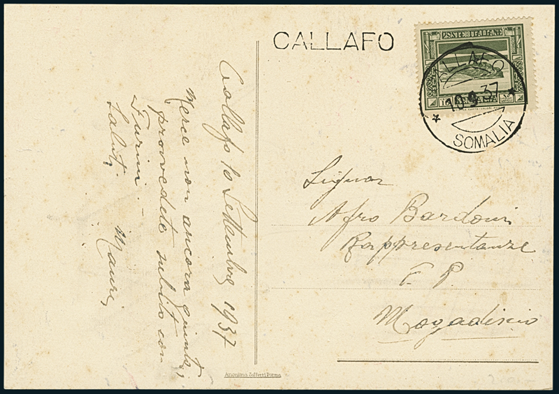 CALLAFÒ. Cartolina per Mogadiscio affrancata con Somalia 15 c. (216), con annullo nitido "Callafo/Somalia/10.9.37" (p. R). Molto rara.