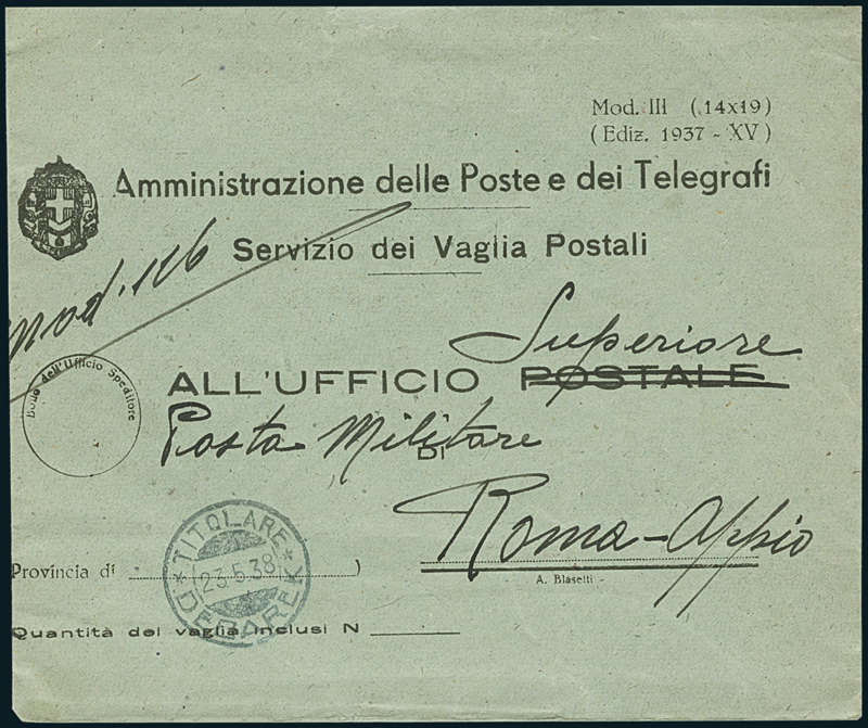 DEBAREK. Busta del servizio dei vaglia postali dell'amministrazione delle poste e dei telegrafi, leggermente ridotta a sinistra, per l'ufficio superiore di posta militare a Roma-Appio, con timbro nitido "Titolare/Debarek/23.5.38" in azzurro con lunette in negativo. Timbro inedito.