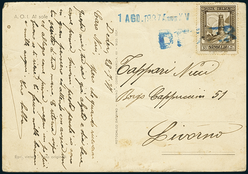 DEDER. Busta per Mogadiscio (Leonzio Marchetti), affr. con Somalia 20c. (217) annullato con lineare "Deder" (in nero!) e datario del 14.6.1937, giorno dell'apertura dell'ufficio, con arrivo al verso; e cartolina per Livorno recante Somalia 30c. (219) annullato con lo stesso timbro in azzurro e datario "1 Ago.1937 Anno XV" (p. 13).