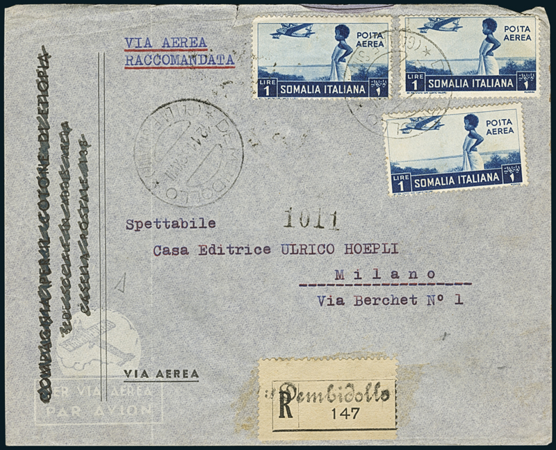 DEMBIDOLLO. Intero postale dell'A.O.I. di 15c. per l'Italia, con affrancatura complementare di Etiopia, Somalia ed A.O.I. per 1,35l.; e raccomandata per Milano recante Somalia P.A. tre 1l. (21), tutti annullati con "Dembidollo/(Galla e Sidama)" (p. 12).