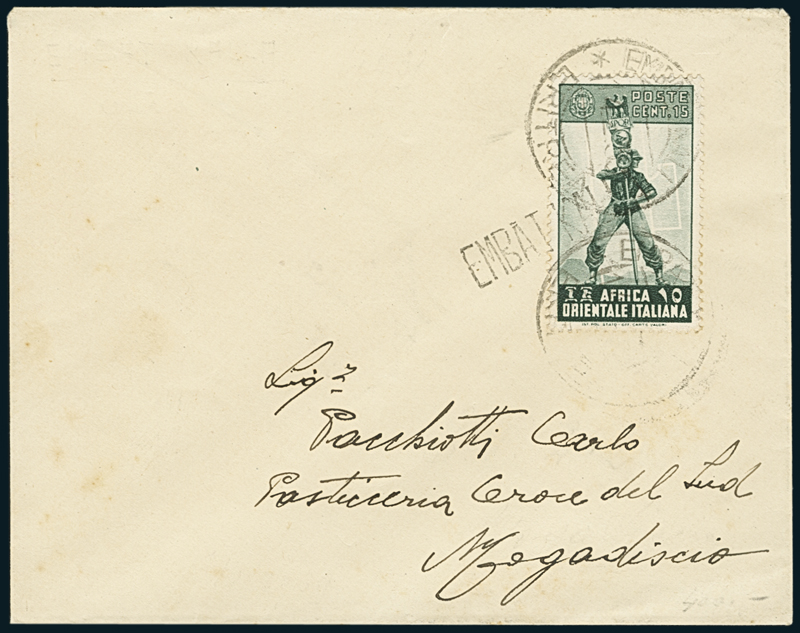 EMBATCALLA. Busta per Mogadiscio affr. con A.O.I. 15c. (5), con doppia impronta del "Embat Kalla/Eritrea/14.2.39" e timbro lineare "Embat Kalla" (p. 12+).