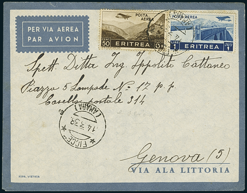FICCÉ. Busta per Genova con P.A. 50c. (18) ed 1l. (21), con belle impronte del "Ficce'/(Amara)/14.3.38" (p. 12).