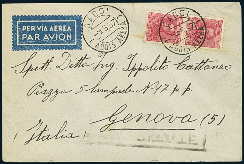 GAGGI. Busta per Genova recante coppia del 75c. (200), annullati, con timbro ripetuto a lato, con "Gaggi/(Addis Abeba)/9.6.37" (p. 12), un mese dopo l'apertura dell'ufficio postale. Splendida.