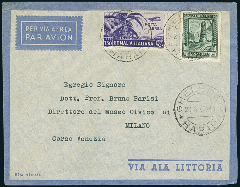 GHELEMSO. Busta per Milano recante Somalia 25c. e P.A. 1,5l. (218, 22), annullati con "Ghelemso/Harar/20.5.40" con stelle (p. R), ripetuto a lato. Splendida e grande rarità negli annullamenti dell'Eritrea.