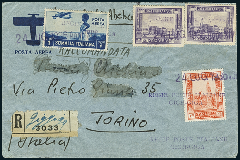 GIGGICA. Raccomandata per Torino con Somalia 50c., due esemplari, e 1,75l. (221, 224), e P.A. 1l. (21), annullati con timbro a due righe "Regie Poste Italiane/Gigh-Giga" in violetto (p. 12) con datario "24 Lug. 1936 XIV", e talloncino di raccomandazione con nome della località in manoscritto. Molto bella e di grande effetto.