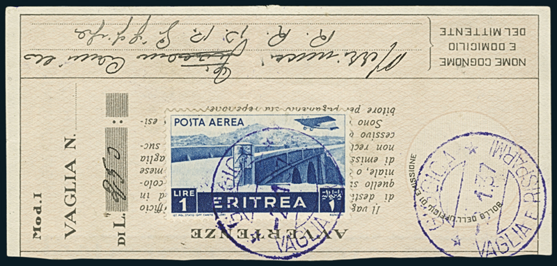 GIGGICA. Vaglia affr. con P.A. 1l (21), bollato con "Giggica/Vaglia e Risparmi/2.1.37" in violetto! (p. 12+). Leggera piega appena visibile.