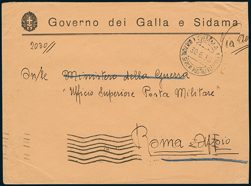 GIMMA. Busta in franchigia intestata "Governo dei Galla e Sidama" per Roma, con "Gimma/(Direzione Serv.zi Postali Elettrici)/30.6.38" in azzurro (p. 12+), con timbro corrispondente al verso con stemma sabaudo.