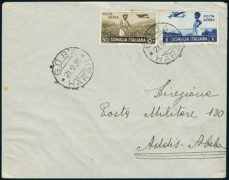 GOBA. Due buste, una raccomandata di servizio per la Direzione della P.M. a Roma; l'altra, per la P.M. 130 ad Addis Abeba, affr. con Somalia 50c. ed 1l. di posta aerea (18, 21), con timbri diversi "Goba/Harar" (p. 12 + p. 12). Insieme raro.