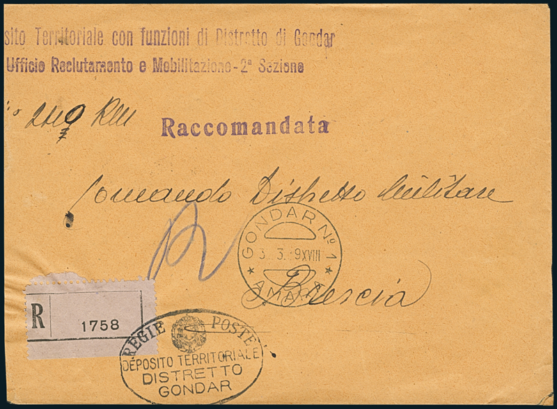 GONDAR. Raccomandata in franchigia, leggermente ridotta a sinistra, del "Deposito Territoriale con Funzioni di Distretto di Gondar", con splendido annullo "Gondar N°1/Amara/31.3.39" (p. 13).