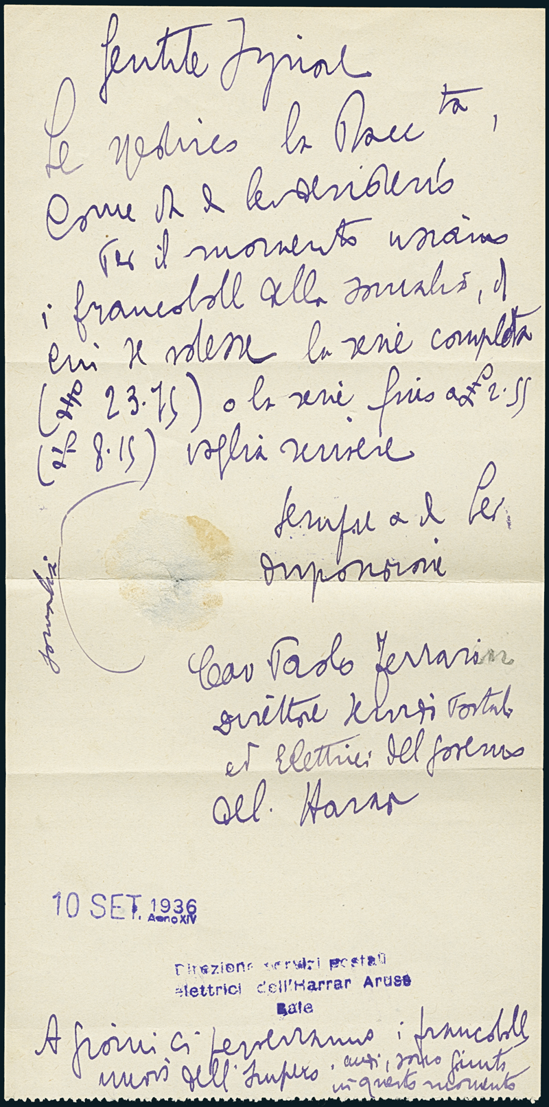 HARAR. Busta per l'Italia affrancata con Somalia 25c. verde (218), due esemplari, ed 1l. di posta aerea (21), annullati in nero con lineare a due righe "Poste Imperiali Italiane/Harrar". Inoltre nota manoscritta con la quale il direttore dei servizi postali dell'Harar comunica l'arrivo dei nuovi francobolli dell'Impero. Insieme molto interessante.