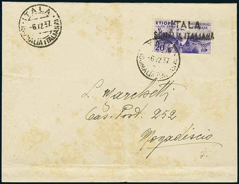 ITALA. Busta per Mogadiscio, affrancata con Etiopia 20 c. (2), annullata con timbro a data d'Itala (6.12.37) e lineare su due righe "Itala/Somalia Italiana". Inedito.