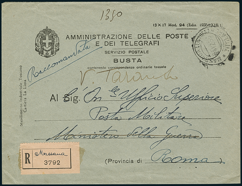 MASSAUA. 1936-38, tre buste, una raccaomandata in franchigia con "Massaua (Eritrea)/Titolare" (p. 10), raccomandata per Roma con "Massaua-Vaglia/(B)" (p. 8) e bsuta per Mogadiscio con "Massaua (Eritrea)/Vaglia" (p. 8).
