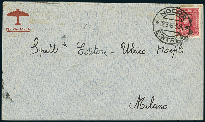 NOCRA. Busta per Milano recante un 75 c. (200), nitidamente annullato "Nocra/Eritrea/29.6.39" (p. 12).