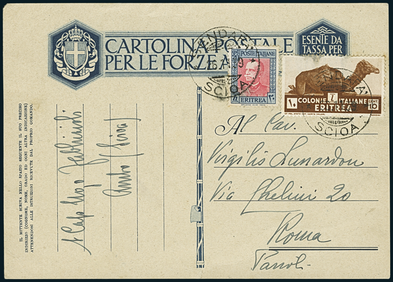 SENDAFÁ. Cartolina di franchigia militare per Roma, recante un 20c. (196) ed un 10c. (205), annullati con "Sendafa'/Scioa/26.11.39" (p. 13). Molto bella e rara.