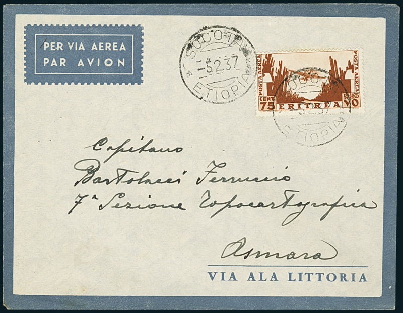 SOCOTÁ. Busta per Asmara affr. con P.A. 75c. (20), annullato con doppia impronta del "Socota'/Etiopia/5.2.37", primo tipo (p. 12).