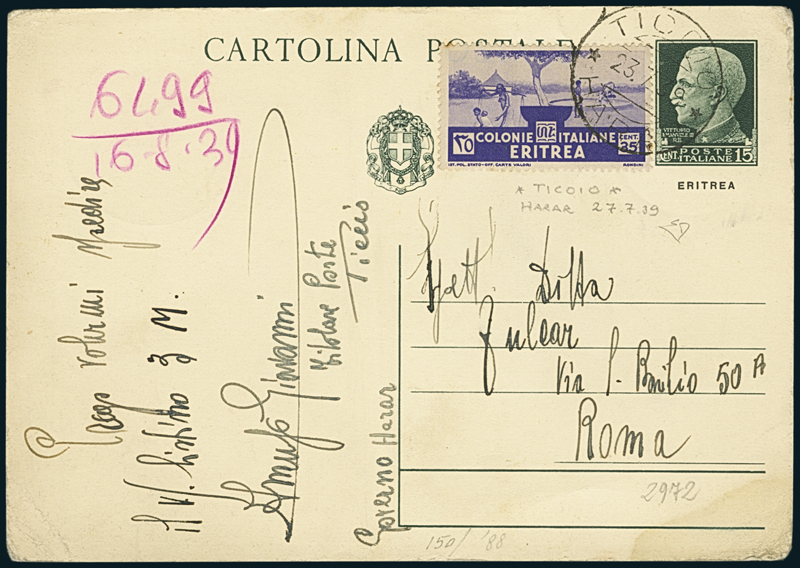 TICCIÒ. Intero postale soprastampato "Eritrea" da 15c., con affrancatura complementare da 35c. (208). entrambi annullati con "Ticcio'/Harar/23.7.39", secondo tipo (p. 13).