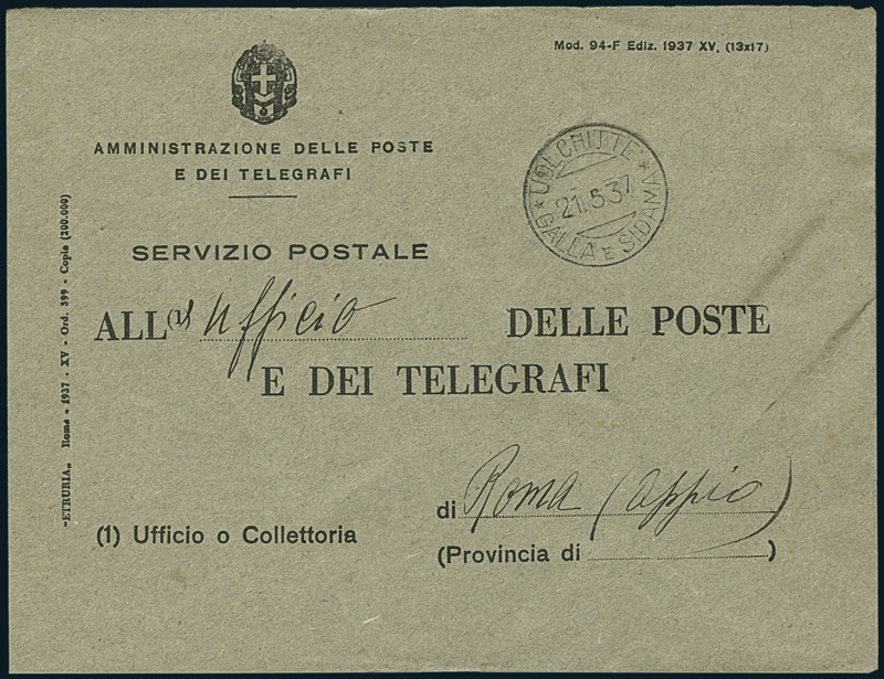 UOLCHITTÉ. Busta in franchigia per Roma con nitida impronta del bollo "Uolchitte'/Galla e Sidama/21.5.37" (p. R), che anticipa di quasi sette mesi quella che si credeva la data d'apertura (7.12.37). Rarità degli annullamenti dell'Eritrea.