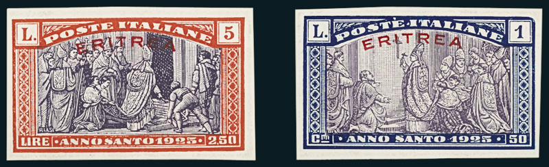 1925, Anno Santo, giro completo di 24 prove d'archivio non dentellate delle quattro Colonie. Raro insieme.