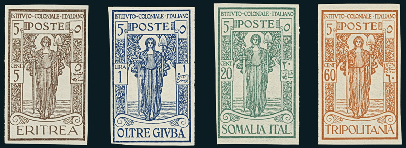 1926, Pro Istituto Coloniale, giro completo delle 24 prove d'archivio delle quattro colonie, su carta sottile non gommata. Raro insieme.