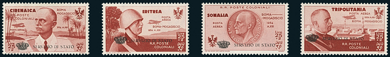 1934, Servizio di Stato, 25 l.+ 2 l. carminio bruno, il giro delle quattro "Coroncine" comprendente Cirenaica, Eritrea, Somalia e Tripolitania. Insieme raro e di pregio.