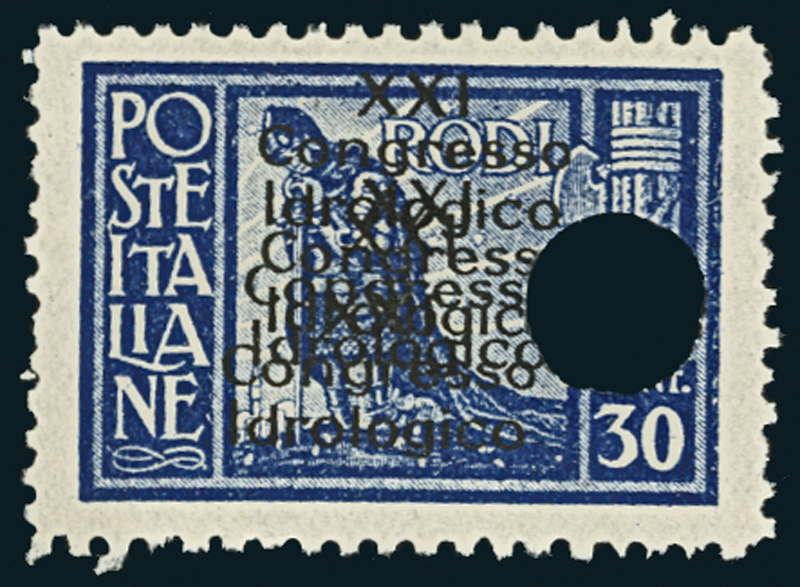 1930, Congresso Idrologico, 30 c. azzurro,tripla soprastampa con grosso foro (16k, senza prezzo). Rarissimo francobollo di cui sono noti solo un singolo e un blocco di quattro.