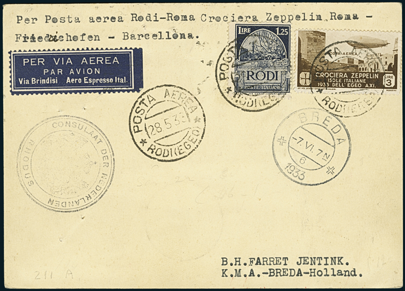 1933, cartolina via aerea da Rodi del 28 maggio per Breda (Olanda), affrancata con Egeo “Pittorica” da lire 1,25 e da lire 3 “Zeppelin” di Posta Aerea (9, P.A. 22), annullati col timbro “Posta Aerea/Rodi (Egeo), volata con l’Aero Espresso Italiano via Brindisi.