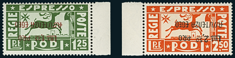 1943, Pro Assistenza Egeo, espressi 1,25 l.+ 1,25 l. verde e 2,50 l.+ 2,50 l. arancio, entrambi con soprastampa capovolta (E3a, E4a), bordi di foglio. Firmati Fiecchi.