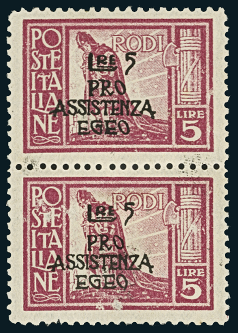 1943, pro Assistenza Egeo, 5 l.+ 5 l. lilla rosa, senza filigrana (125A), coppia verticale con l'esemplare superiore perfetto ed integro, mentre quello inferiore presenta leggere abrasioni e linguella. Rarissima coppia di un francobollo di cui si conoscono solo 20 esemplari, generalmente difettosi, e la quotazione di catalogo, 100,000 € per questi due francobolli singoli, si riferisce a queste condizioni. In questo caso, il francobollo superiore, ha un valore molto più alto che quello del catalogo; inoltre, bisogna considerare che si tratta di un multiplo; entrambe le condizioni del tutto straordinarie. Assolutamente eccezionale, sicuramente la rarità più importante delle Isole dell'Egeo.