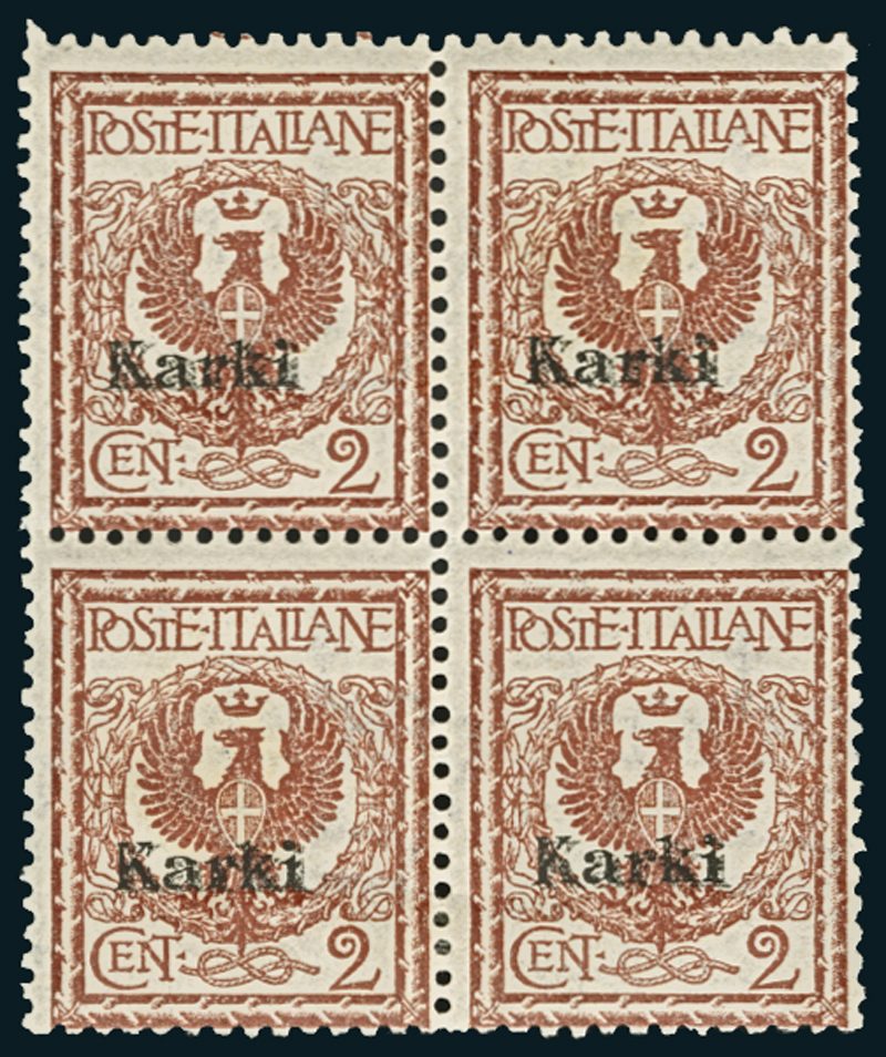 Carchi. 1912, Floreale, 2 c. rosso bruno, doppia soprastampa (1a) in blocco di quattro. Firmato A. Diena e Fiecchi.