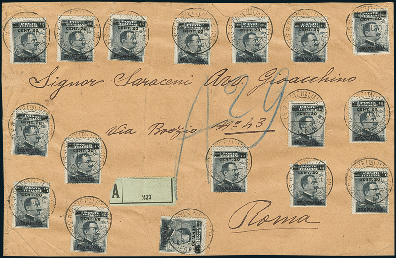 Stampalia. Grande frontespizio di busta assicurata da Stampalia per Roma, affrancata con diciassette esemplari del 20c. su 15c. grigio nero (8), annullati col timbro “Poste Italiane/Stampalia (Egeo)” con date diverse del 6, 8 e 11 ottobre 1920. Affrancatura molto rara e di effetto.