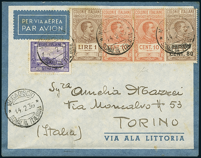 Fiscali Usati per Posta. 1936/37, quattro buste per l’Italia e una cartolina per l’interno affrancate con valori fiscali delle Colonie, un paio tassate. Ottima qualità, raro insieme, da esaminare.