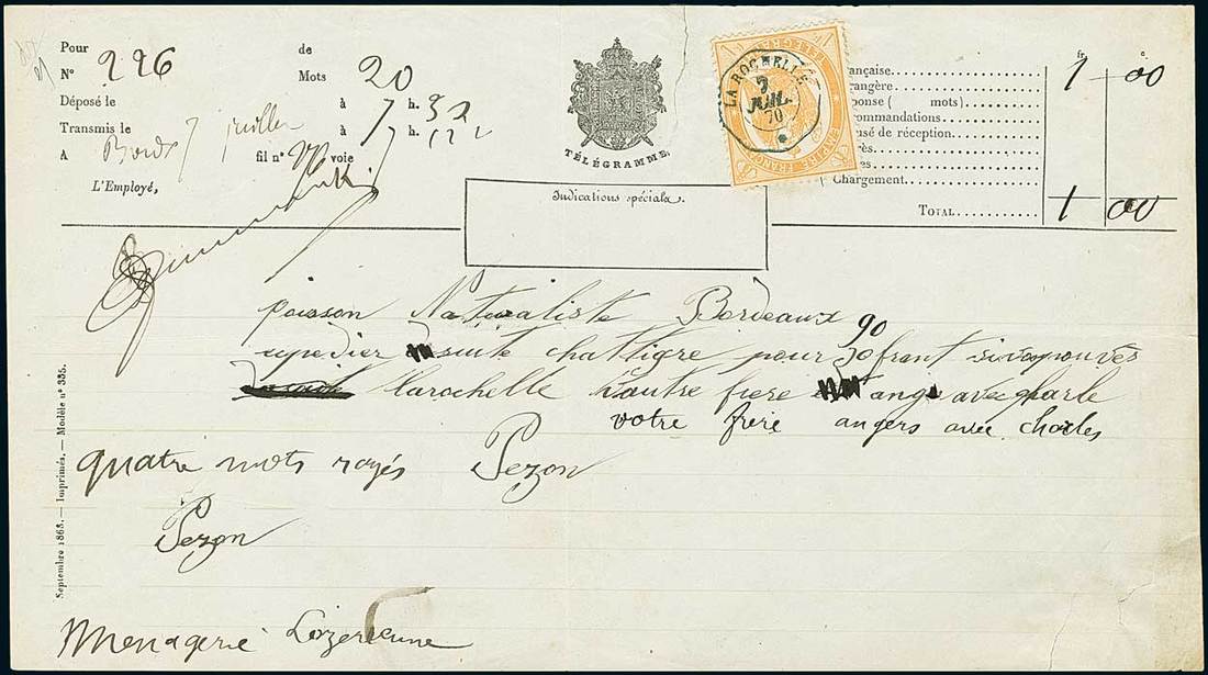 Telegrams, Telegraph & Telephone Stamps - The Professor Shaul Ladany Collection, Part IIFranceTelegraph Stamps1870, 1fr. orange, quite well centred, fresh used on telegram form of 20 words, tied by neat "La Rochelle/7 Juil 70" telegraphic datestamp. Very fine and rare. Cert. Robineau-Pothion. Maury 7. Ex Dubus. Photo