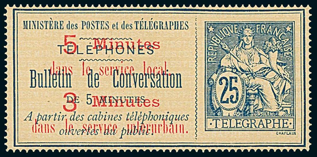 Telegrams, Telegraph & Telephone Stamps - The Professor Shaul Ladany Collection, Part IIFranceTelephone Stamps1896, 25c. Ministry stamp with overprint in red, fine unused. Maury 12; € 2,800. Photo