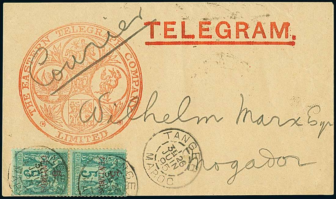 Telegrams, Telegraph & Telephone Stamps - The Professor Shaul Ladany Collection, Part IIFrench Colonies Morocco1895, June 26. "The Eastern Telegraph Company" telegram envelope endorsed "Courier", carried from Tangiers to Mogador, franked by 1891-1900 5c. on 5c. green-yellow pair. Rare. Maury 1a. Photo
